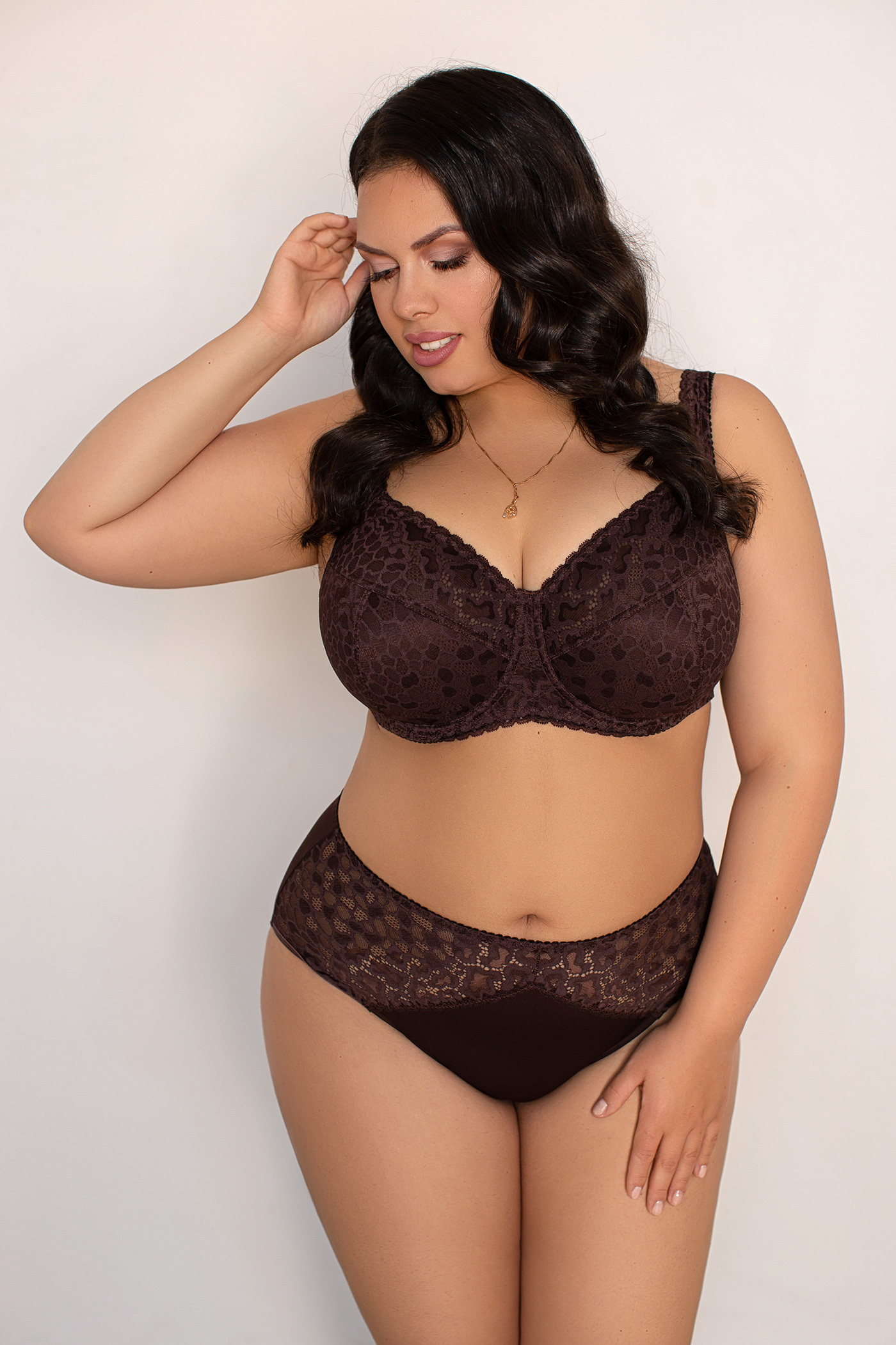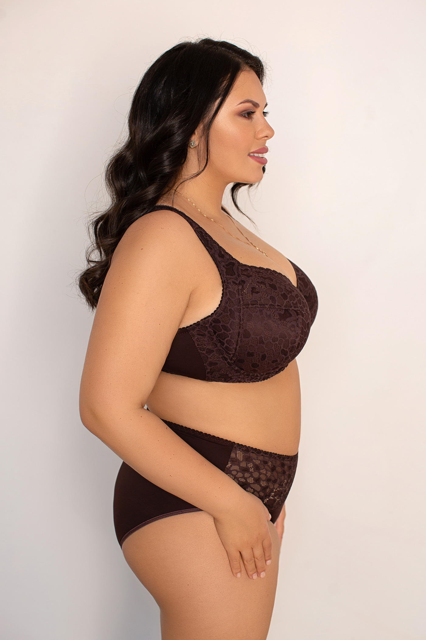 Мягкая чашка из неэластичного функционального трикотажного полотна, комбинированная эластичным кружевом. Бюстгальтер на каркасах, крой чашек и бретелей выполнен с учетом необходимости поддержки большой пышной груди, внутренняя подкладка чашек выполнена из хлопкового полотна.