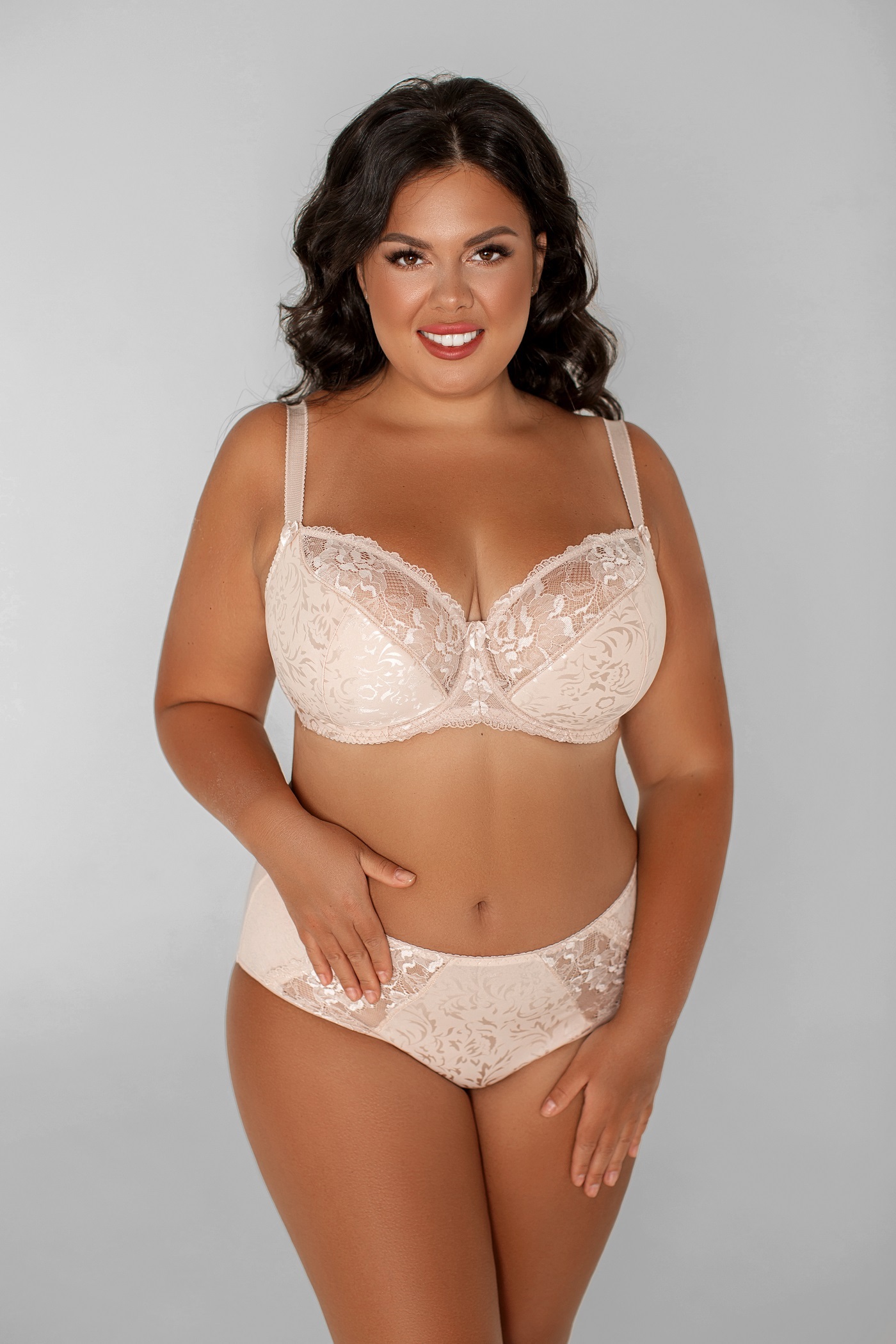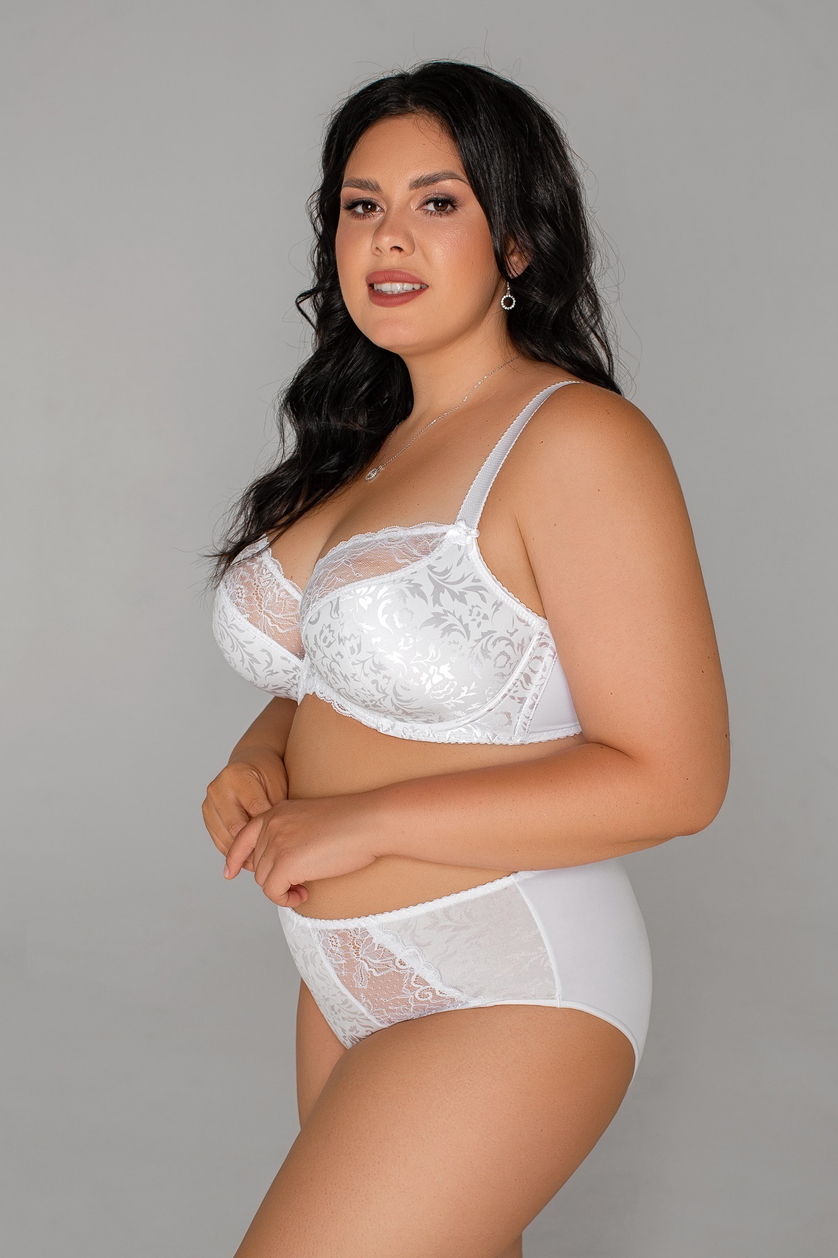 Бюстгальтер с "полупоролоновой чашкой" на каркасах, с боковыми пластинами. Выполнен из эластичного принтованного полотна и эластичного кружева. Пояс дублирован эластичной сеткой в размерах 75H, 80GH, 85GH, 90GH, 95G.