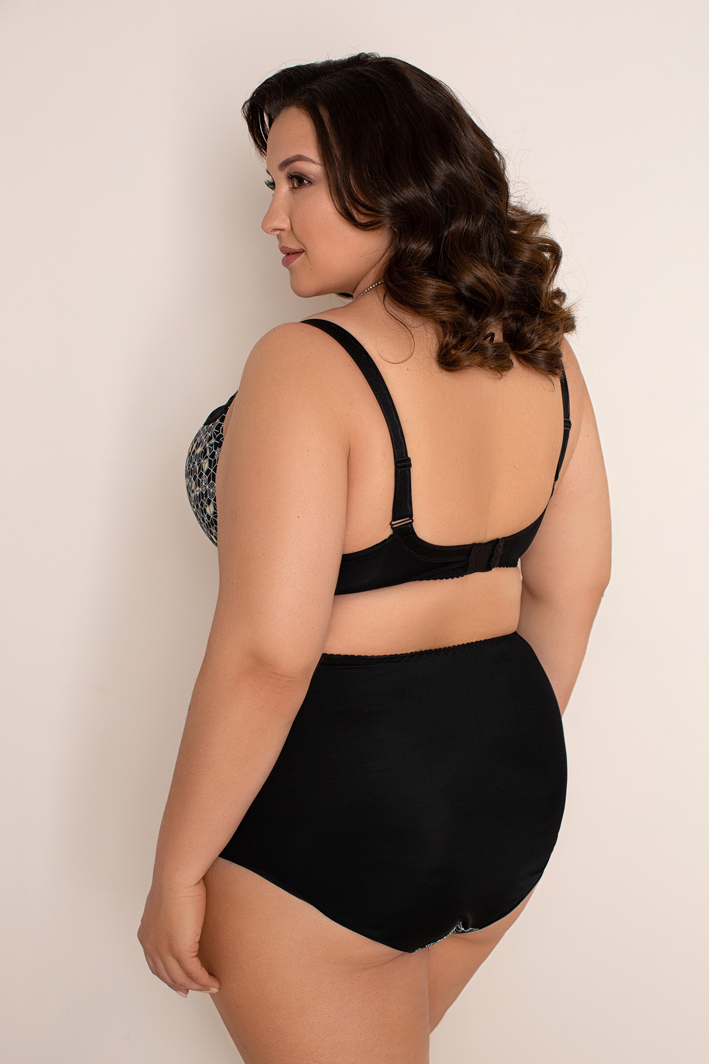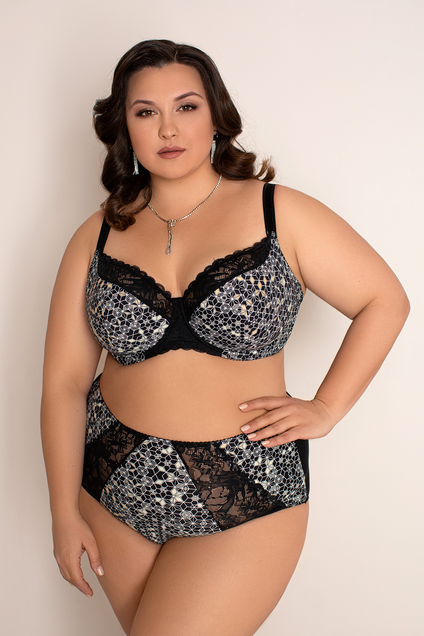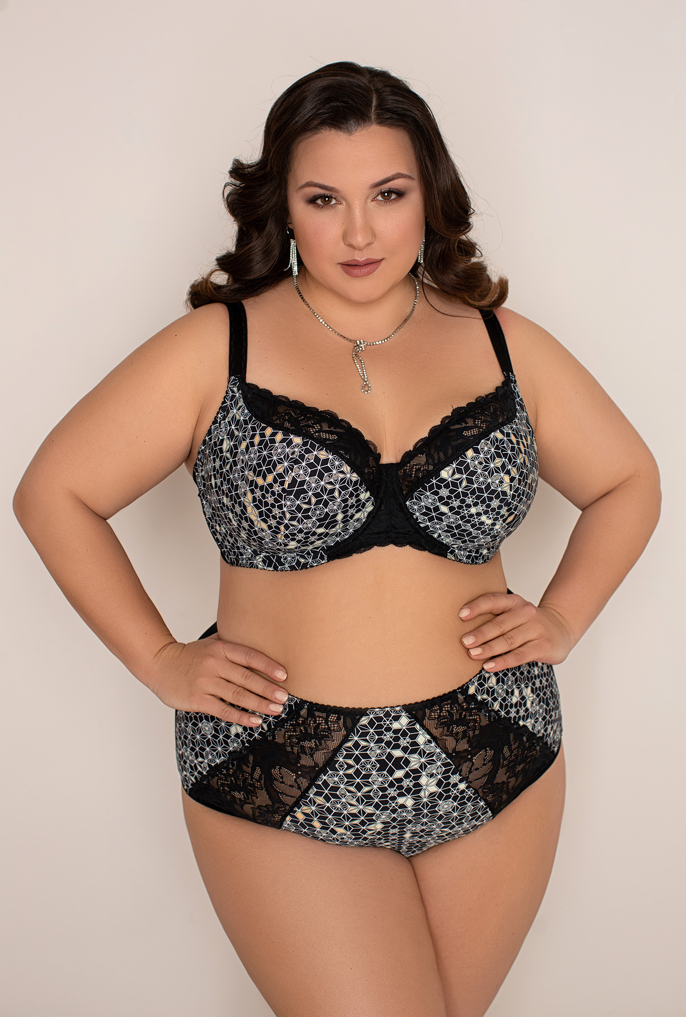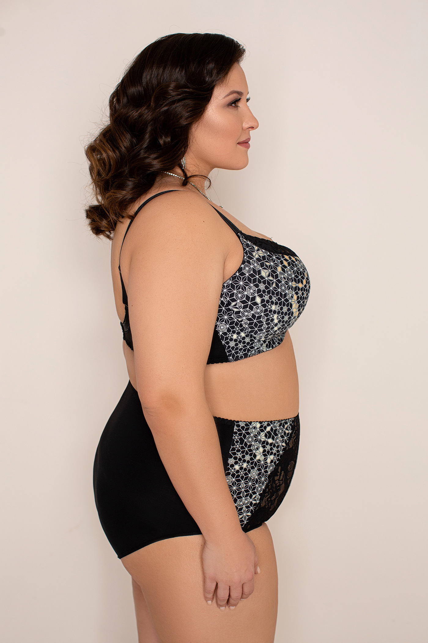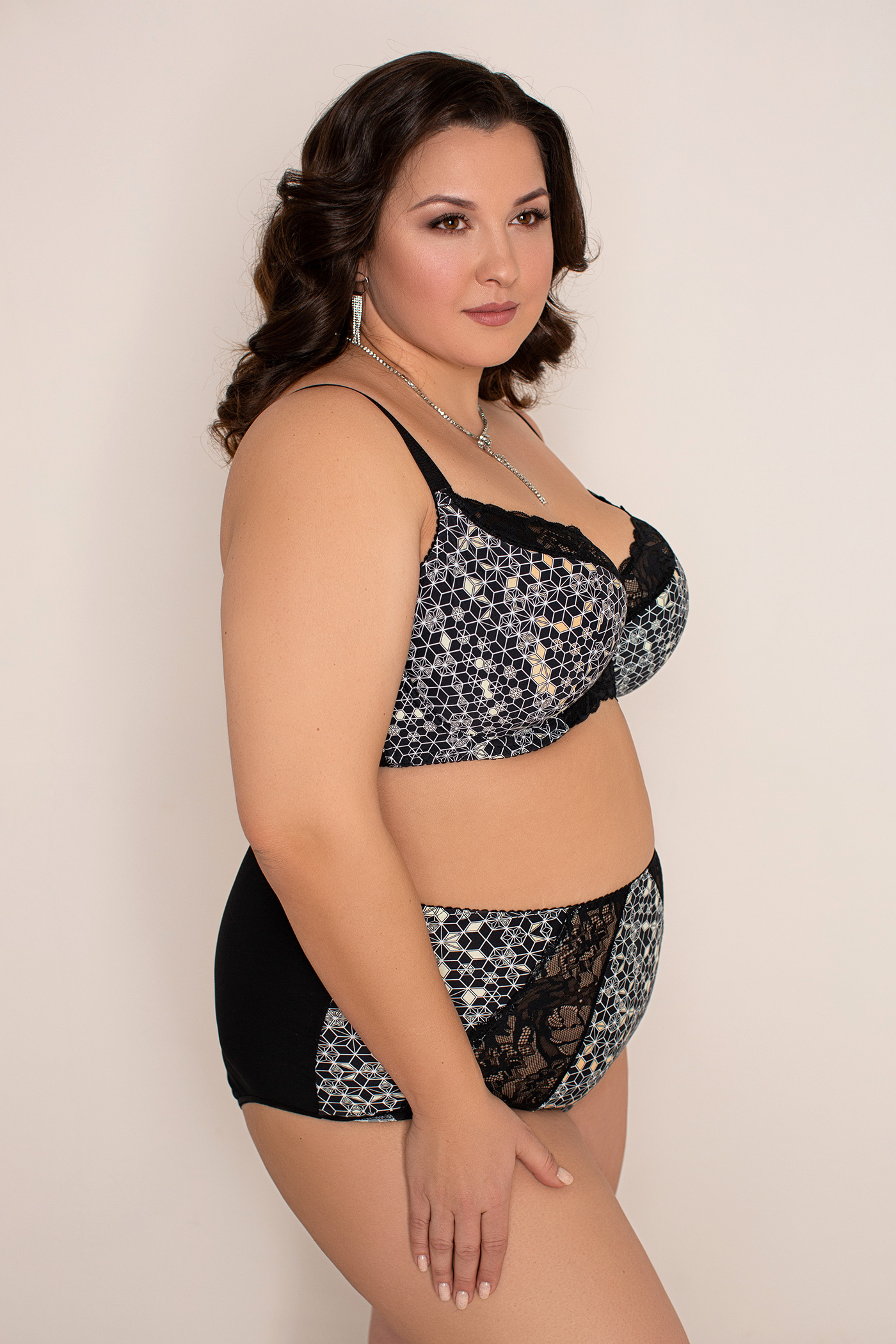 Бюстгальтер с комбинированной чашкой (полупоролон). Верх чашки выполнен из эластичного кружева с дополнительным нижним слоем из эластичной сетки, низ чашки продублирован поролоном. Материал сочетается с благородным кружевом. В модели предусмотрены подгрудные, а также боковые косточки. Модель Б 427 имеет улучшенную конструкцию, которая обеспечивает отличную посадку на фигуре и придает красивую форму груди. Застежка во всех размерах на широкие (57 мм) крючки-петли. В размерах 75G, 80G-90G, 80H-90H, 95G боковая часть пояса бюстгальтера усилена слоем сетки.