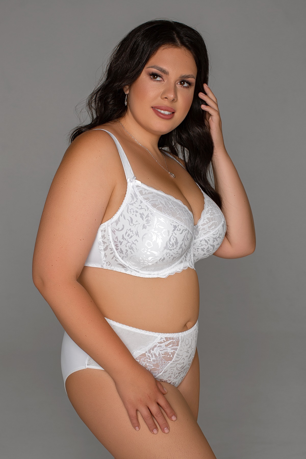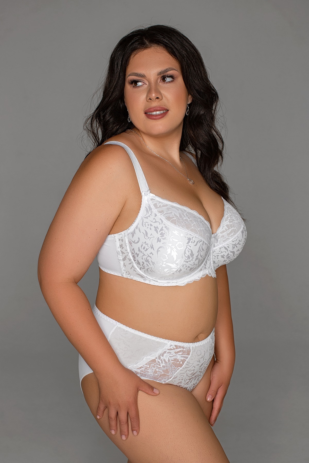 Бюстгальтер с комбинированной чашкой (полупоролон). Верх чашки выполнен из эластичного кружева с дополнительным нижним слоем из эластичной сетки, низ чашки продублирован поролоном. Материал сочетается с благородным кружевом. В модели предусмотрены подгрудные, а также боковые косточки. Модель имеет улучшенную конструкцию, которая обеспечивает отличную посадку на фигуре и придает красивую форму груди. Застежка во всех размерах на широкие (57 мм) крючки-петли. В размерах 75G, 80G-90G, 80H-90H, 95G боковая часть пояса бюстгальтера усилена слоем сетки.