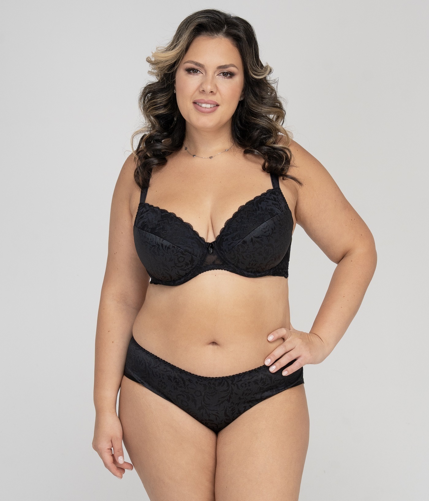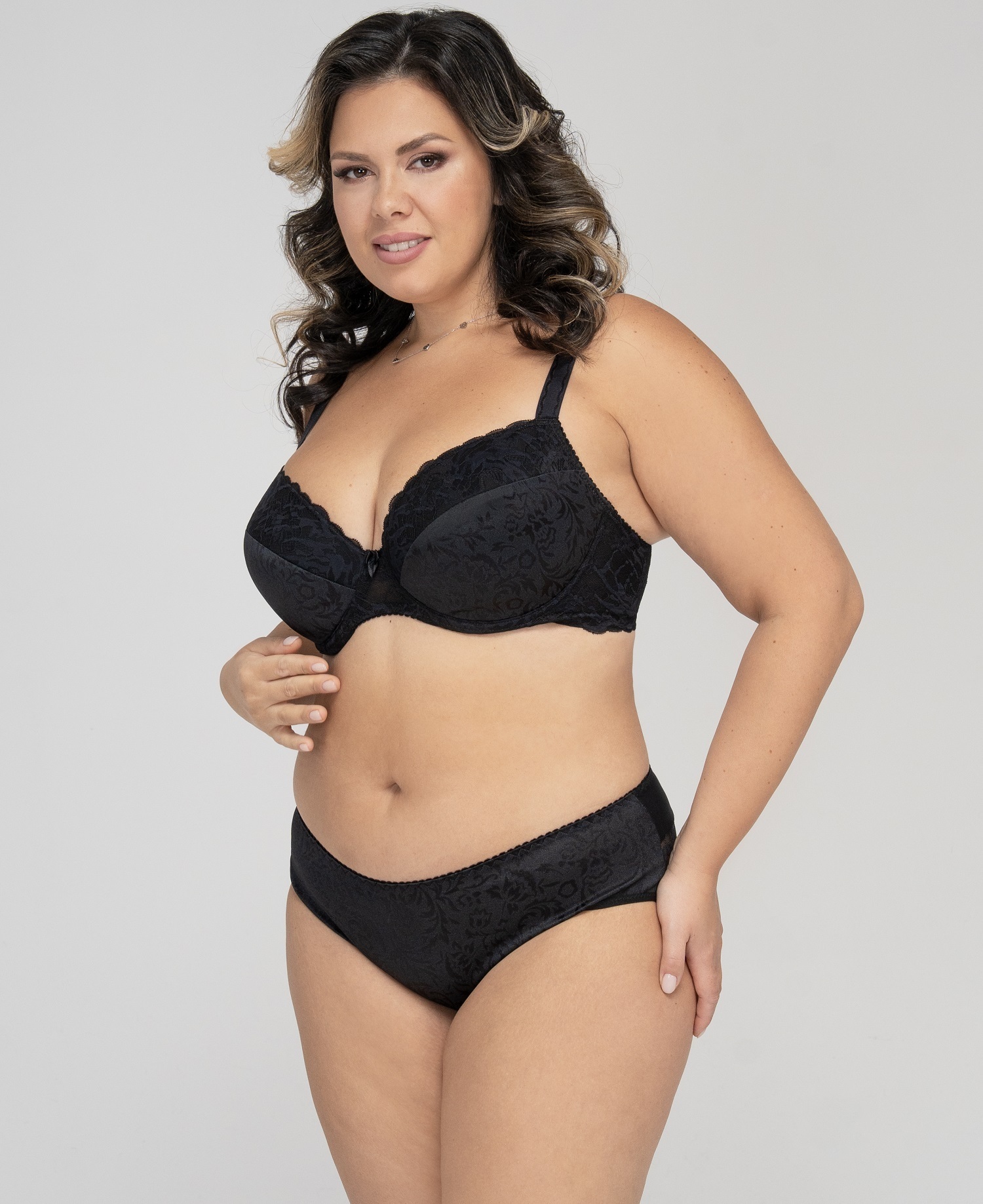 Бюстгальтер с "поролоновой чашкой" на каркасах, выполнен из кружева и эластичного принтованного полотна. Пуш-ап вкладыши в размерах 70ABCDE, 75ABCD, 80ABC, 85AB. Кружевной пояс дублирован сеткой во всех размерах, кроме 70ABCD, 75ABC, 80AB, 85A. Бретель несъемная.