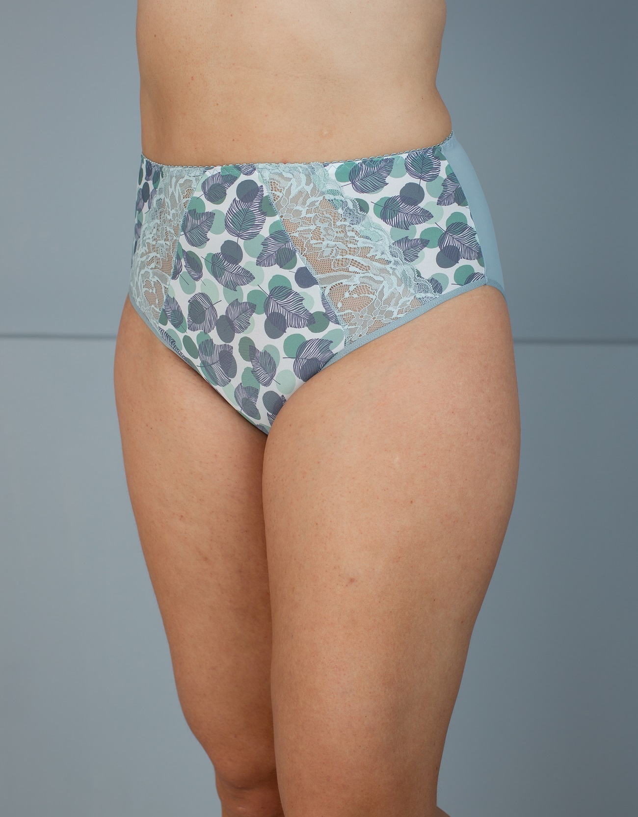 Трусы из эластичного принтованного полотна, эластичного кружева, х/б ластовица, с высокой линией талии. Отделка эластичной декоративной тесьмой.