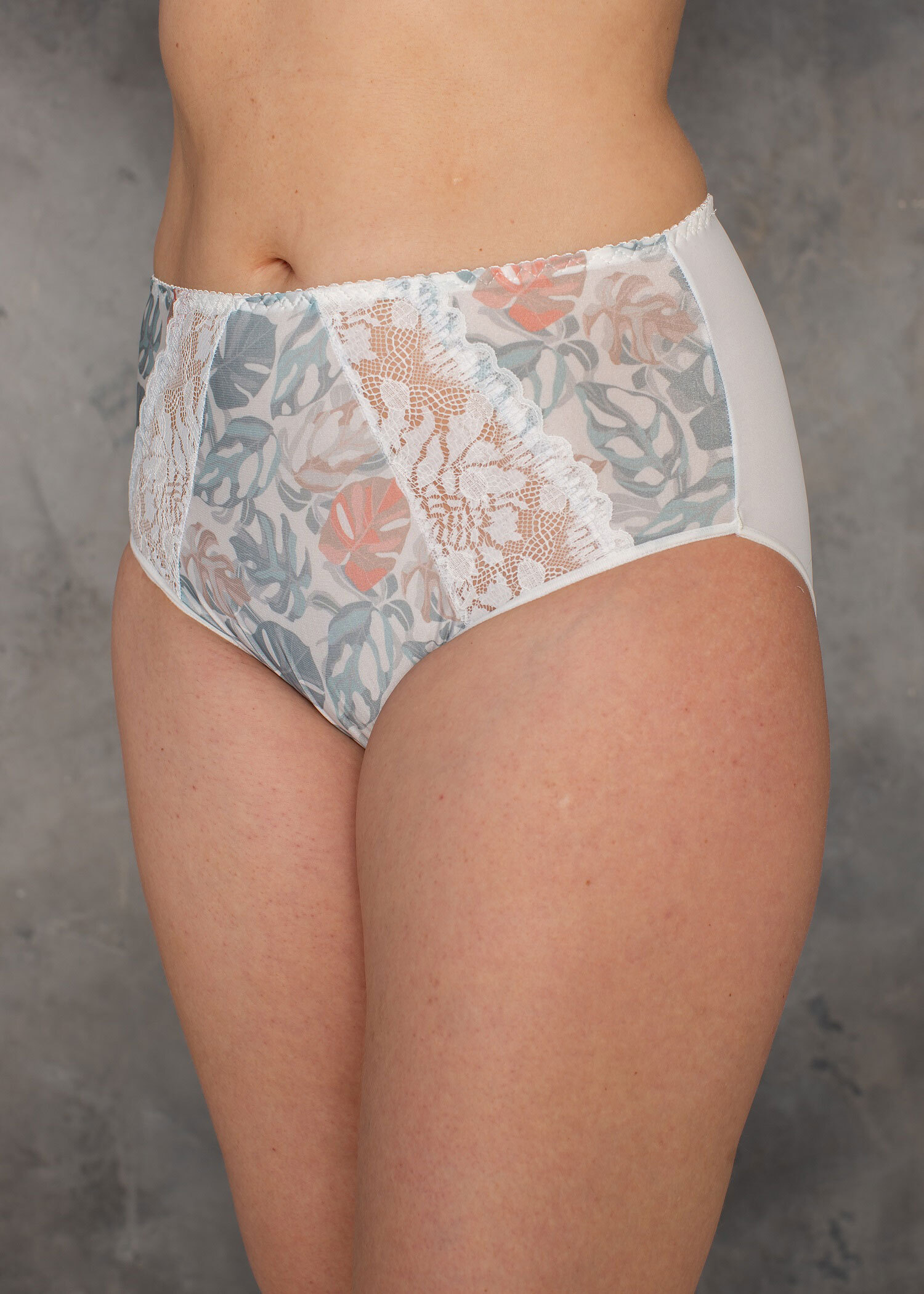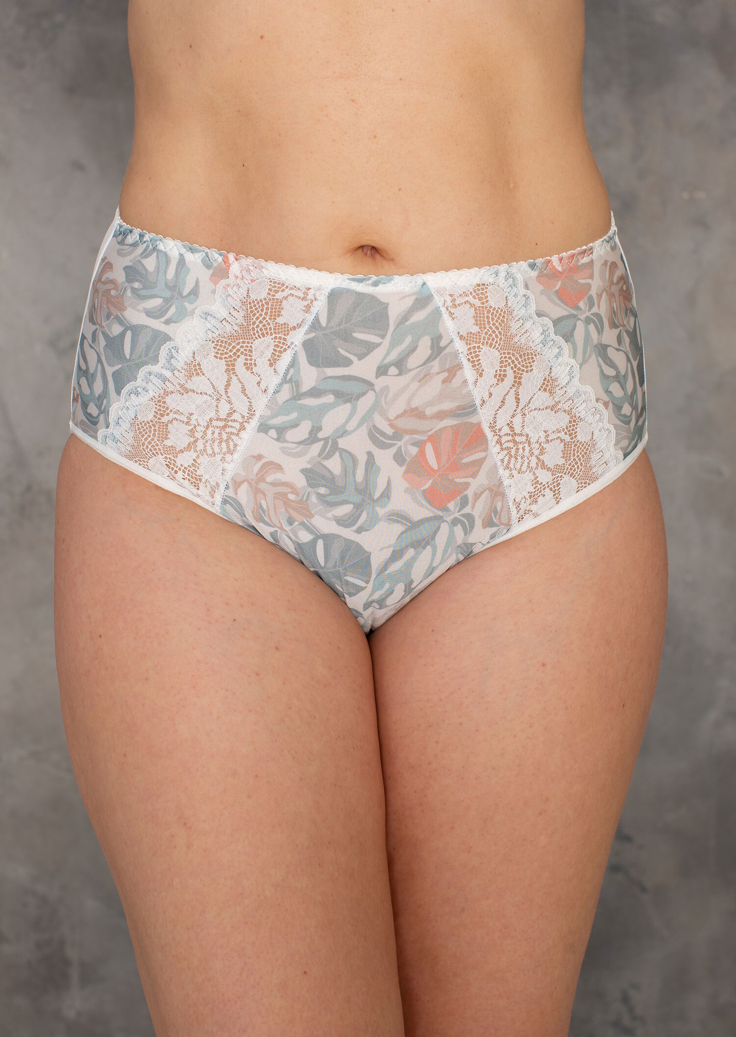 Трусы из эластичного принтованного полотна, эластичного кружева, х/б ластовица, с высокой линией талии. Отделка эластичной декоративной тесьмой.