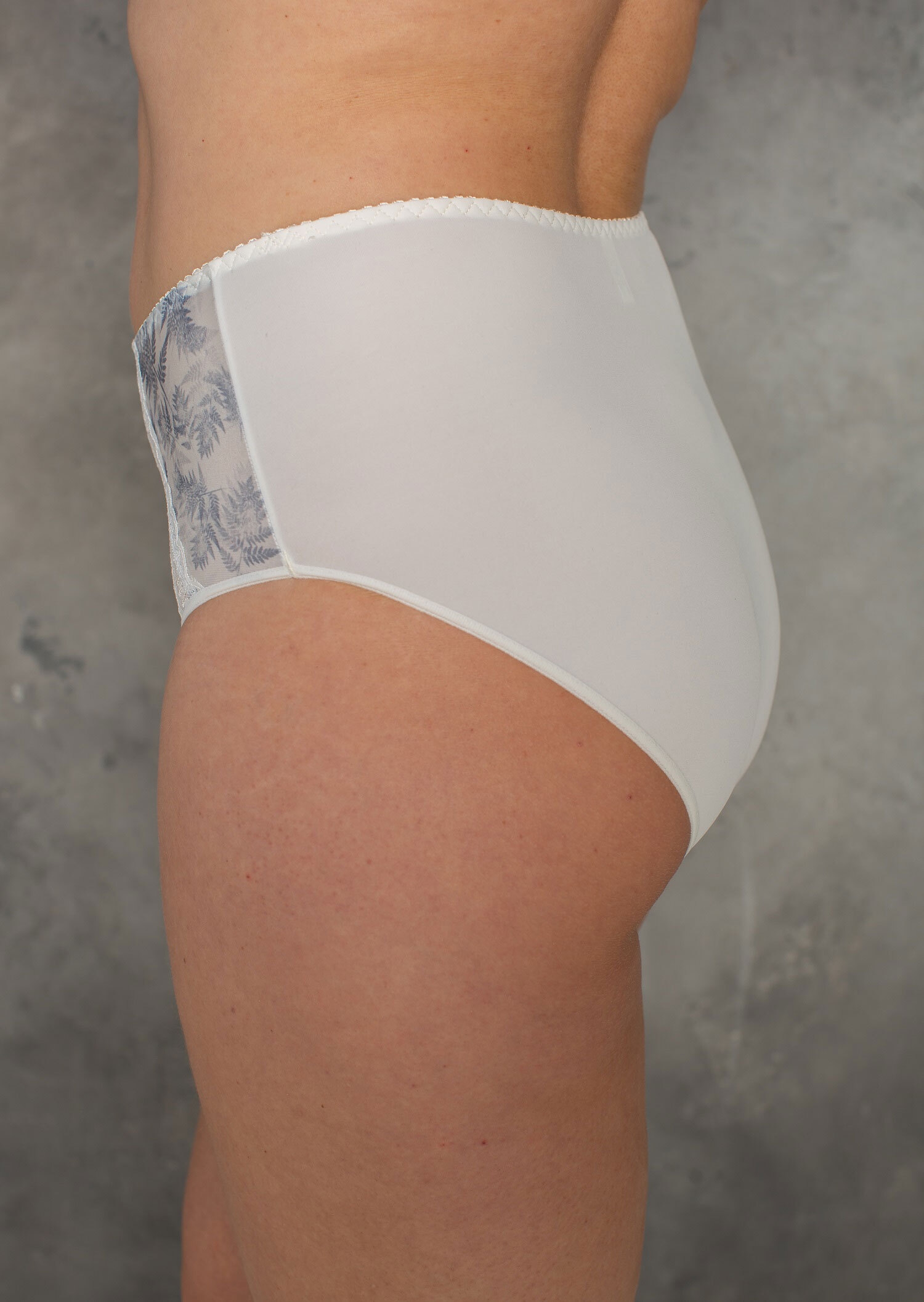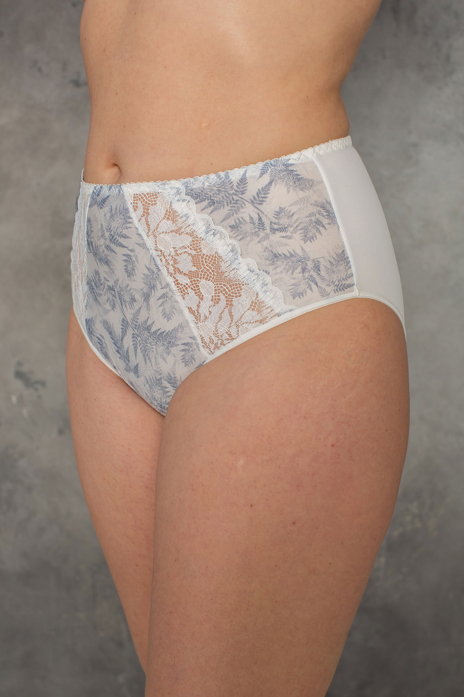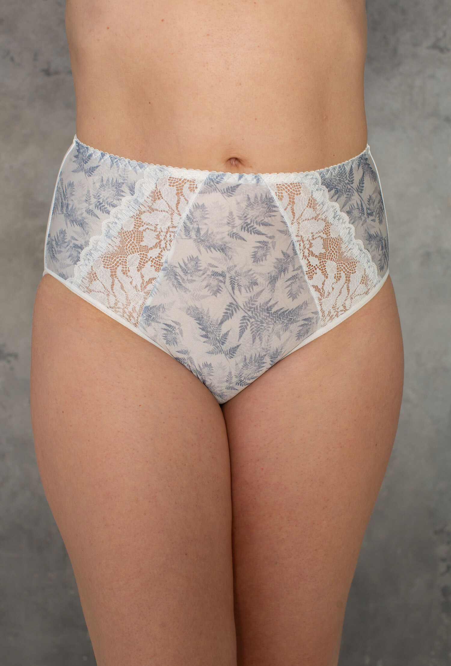 Трусы из эластичного принтованного полотна, эластичного кружева, х/б ластовица, с высокой линией талии. Отделка эластичной декоративной тесьмой.