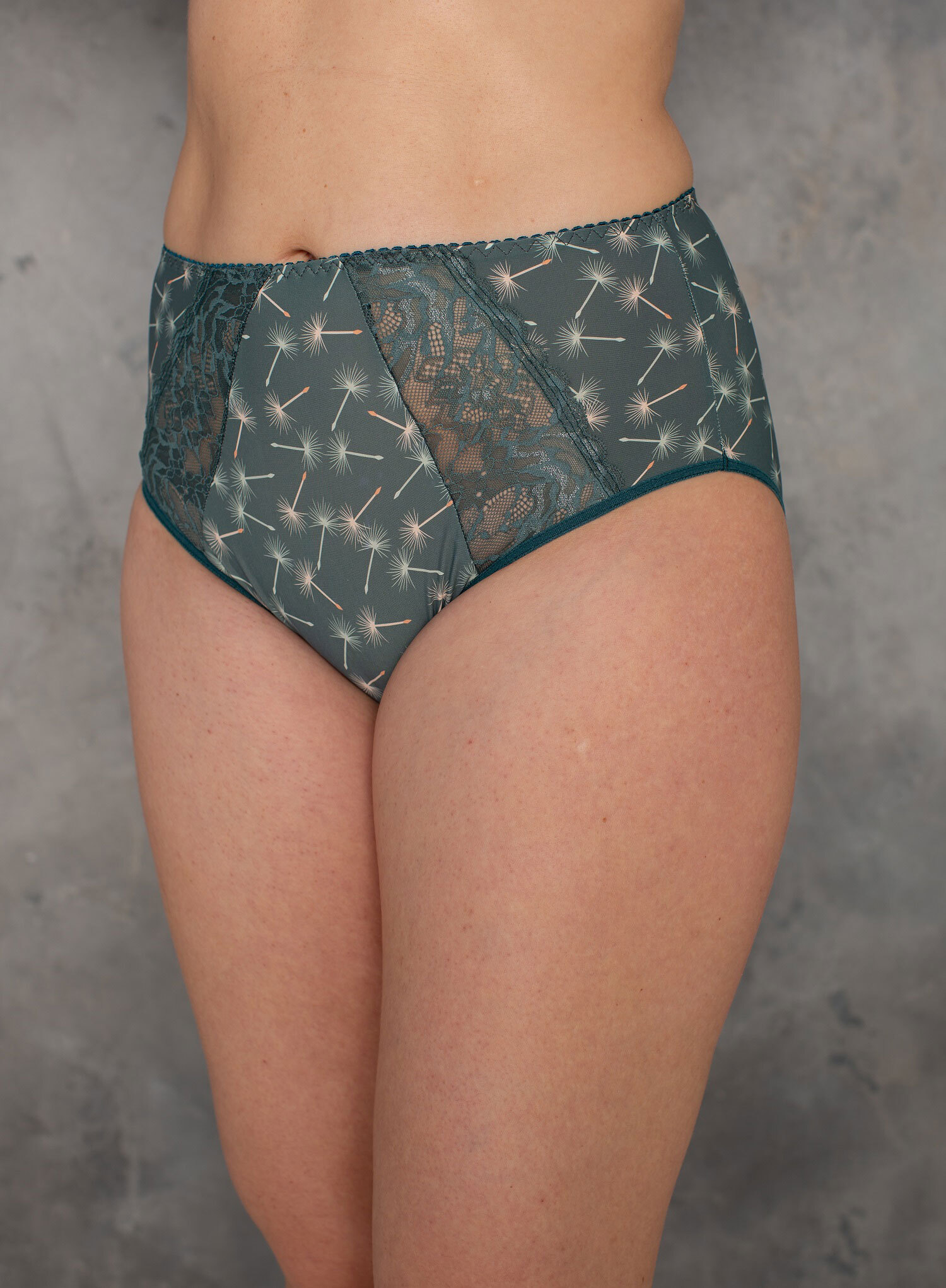 Трусы из эластичного принтованного полотна, эластичного кружева, х/б ластовица, с высокой линией талии. Отделка эластичной декоративной тесьмой.