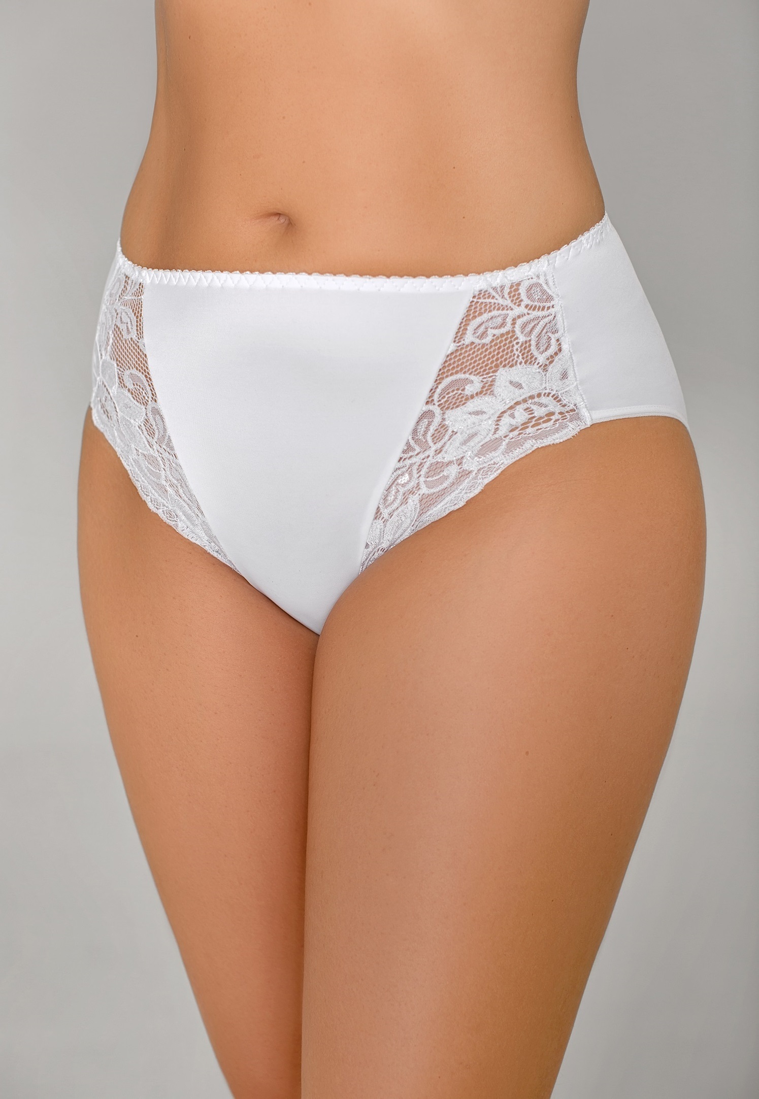 Трусы из эластичного полотна, эластичного кружева, с высокой линией талии. Отделка эластичной декоративной тесьмой.