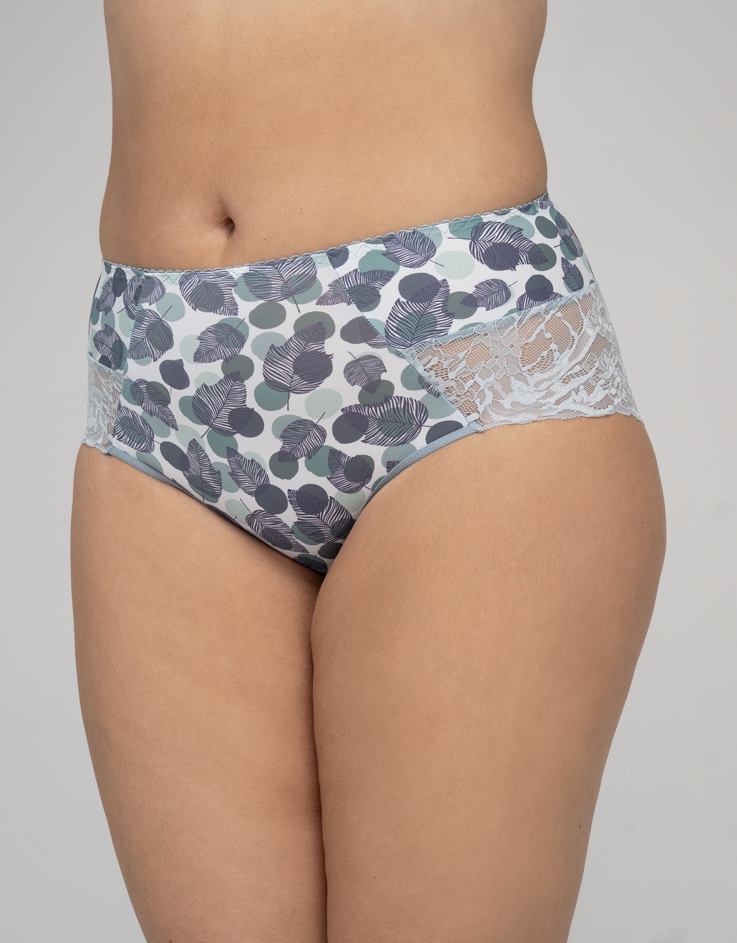 Трусы с высокой посадкой, выполнены из принтованной микрофибры и кружева. Крой трусов позволяет создать красивый силуэт, мягко утягивая животик.